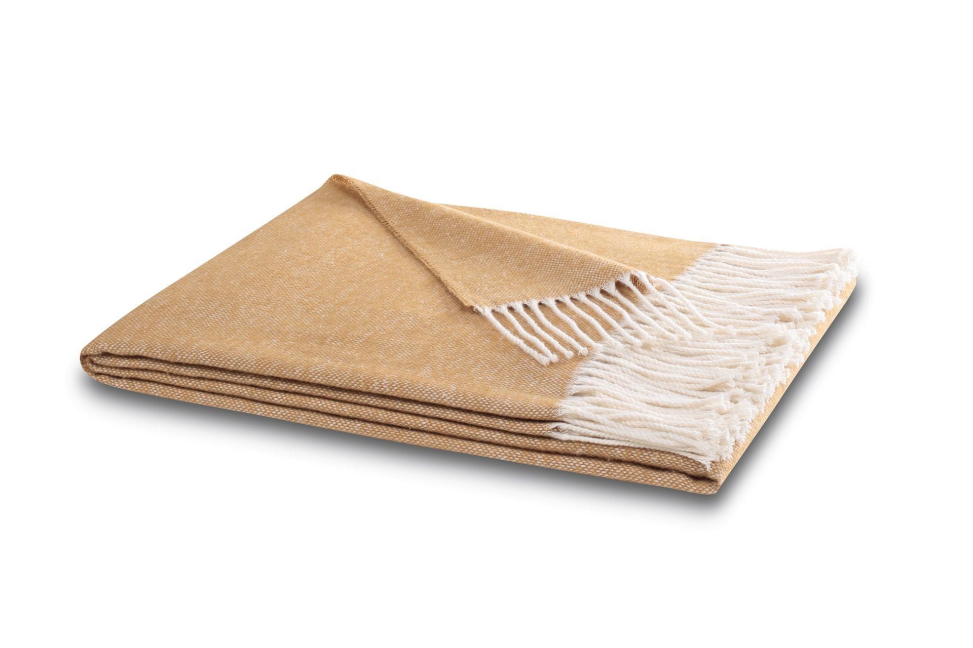 Ein besonders hoher Baumwollanteil von 80% zeichnet dieses moderne Fransenplaid aus. Dadurch eignet es sich perfekt für wärmere Tage – zuhause, auf der Terrasse oder auf dem Balkon. Das Plaid ist ein perfekter Allrounder: angenehm leicht, zeitlos, herrlich unkompliziert. Es hat gedrehte, helle Fransen, die einen spannungsreichen Kontrast bilden zu dem warmen Camelton. Die weiche, pflegeleichte Wohndecke ist besonders hautfreundlich.