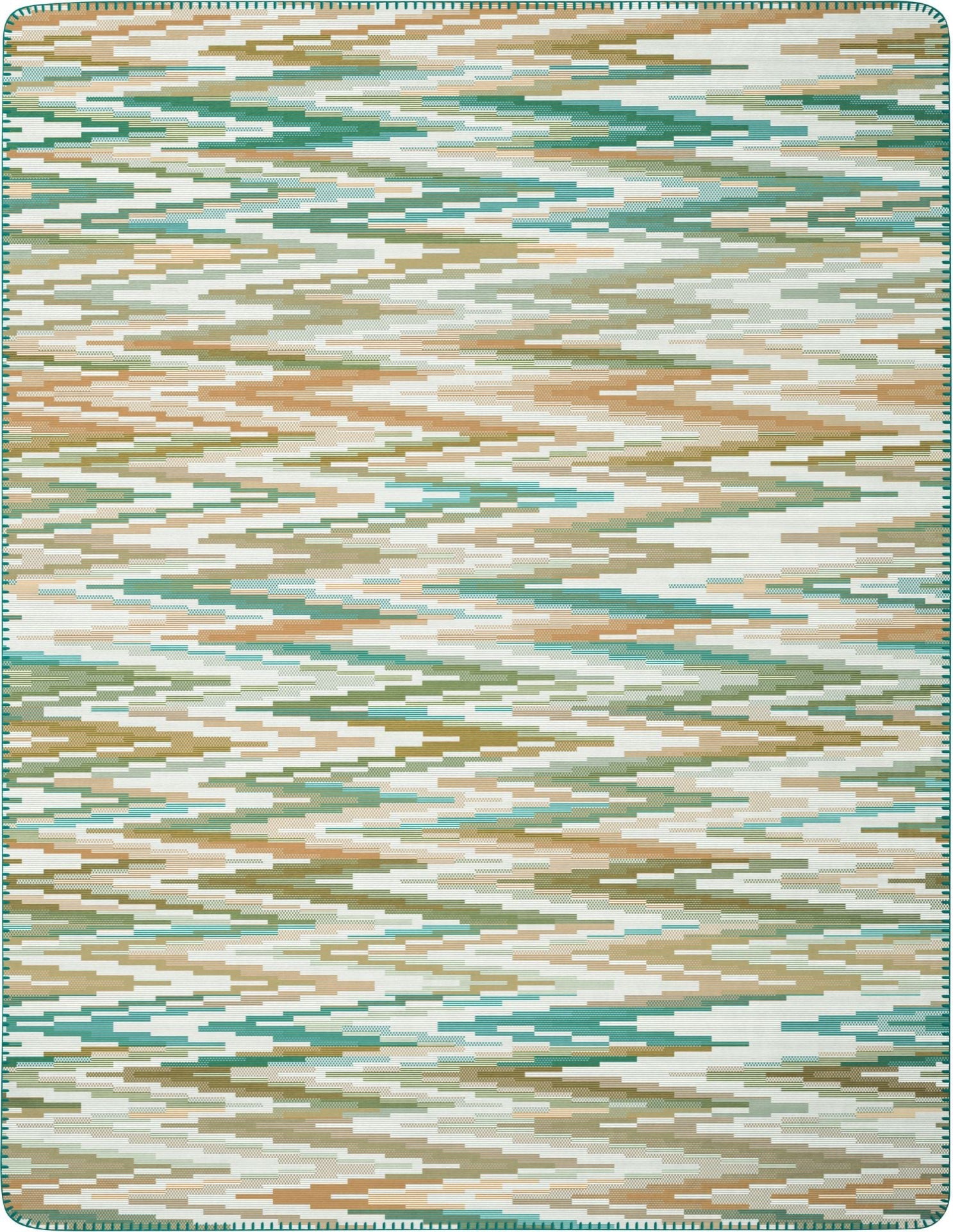 Diese außergewöhnliche Wohndecke fasziniert durch ihr aufwändiges Zickzack-Dessin und eine extravagante Farbkombination. Angesagte Grüntöne wie Salbei und Pesto treffen auf leuchtendes Honigbraun und Azurblau, die blaue Zierstich-Einfassung setzt zusätzliche Akzente. Das filigrane Muster kommt auf der gleichmäßigen Oberfläche besonders gut zur Geltung. Diese Kuscheldecke ist ein echtes Must-have und überzeugt auch als Sofadecke.