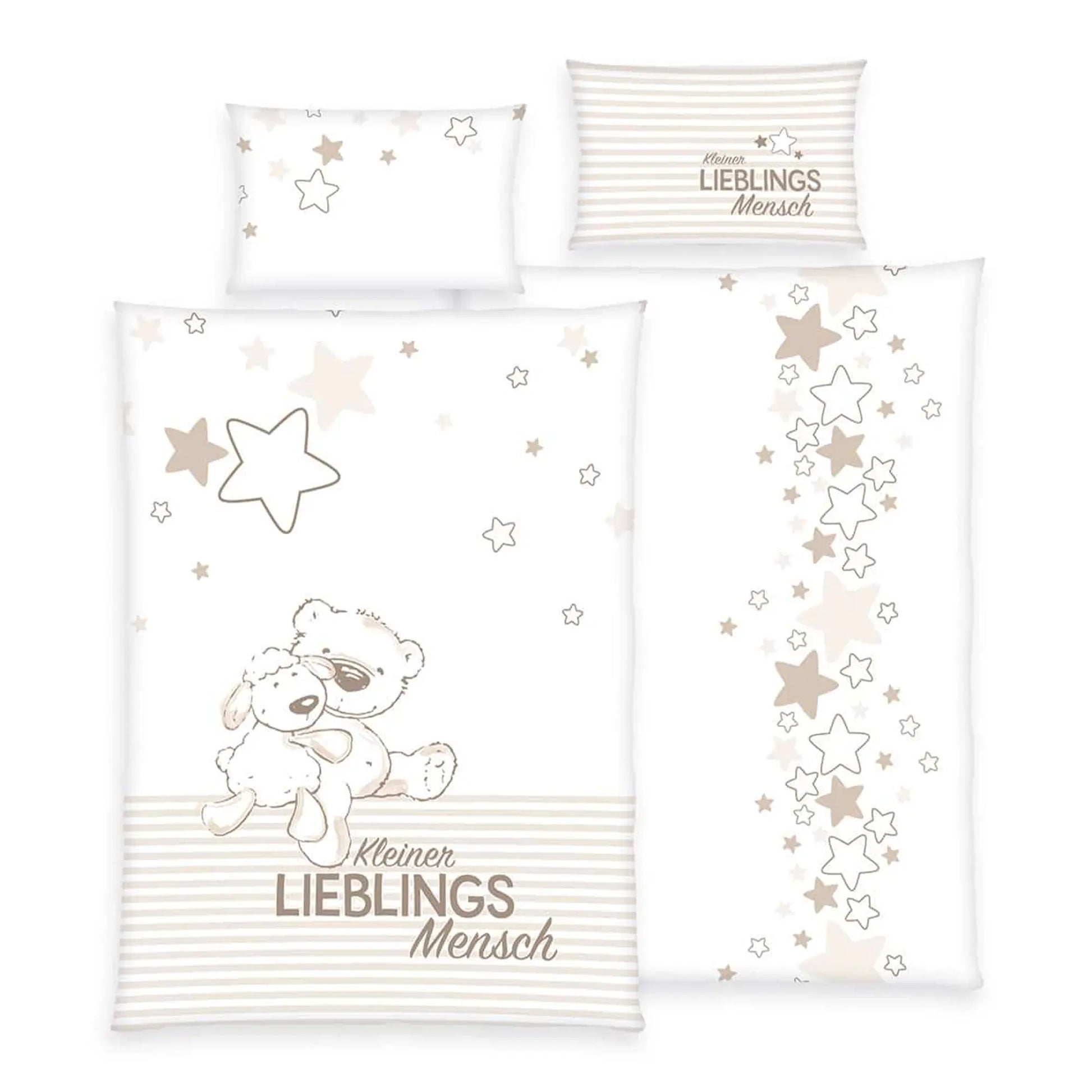 Das süße Lieblingsmensch Design macht die bequeme Bettwäsche zu einem echten Blickfang in jedem Kinderzimmer und zum idealen Geschenk. Dank der kompakten Größe ist die Kleinkinderbettwäsche ideal verwendbar in Reise-, Gitter- und Juniorbetten oder dem ersten großen Bett.