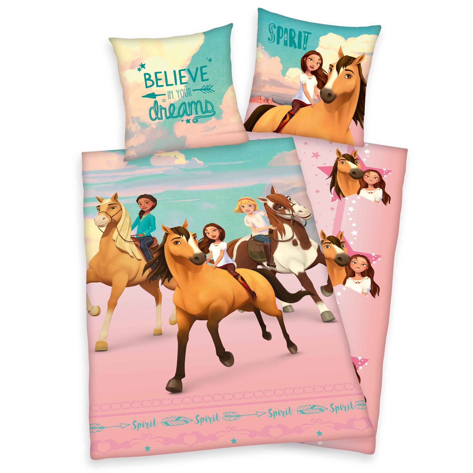 Die atmungsaktive Bettwäsche aus Renforcé Baumwolle ist das ideale Geschenk für Fans des Mustangs Spirit. Vor allem Mädchen lieben die Wendebettwäsche mit dem Design von Spirit – Believe in your Dreams. Mit den kräftigen Farben, der höchsten Qualität in der Materialverarbeitung und einem leichtläufigen Qualitätsreißverschluss haben Sie lange Spaß an dem Bettwäsche-Set.