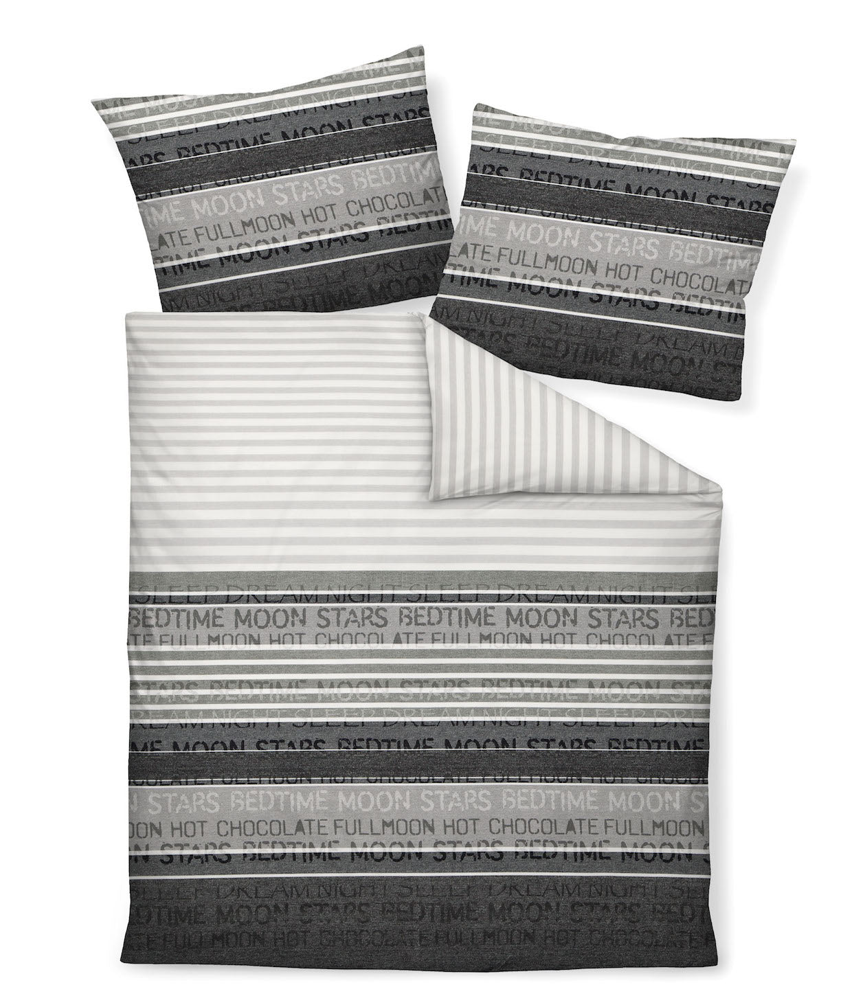 Die Janine Feinbiber Bettwäsche Davos 6481, aus der aktuellen Herbst-/ Winterkollektion von Janine, verleiht ihrem Schlafzimmer eine zeitlose Ästhetik. Das moderne Streifendesign in den Farben Platin und Garphit gibt der Feinbiber-Bettwäsche eine dezente Dynamik. Das Highlight sind die raffinierten Schriftzüge, die das Design auf elegante Weise akzentuiert - ein Hauch von Individualität und Charme, der diese Bettwäsche zu einem echten Blickfang macht. Nicht nur das besondere Design ruft nach gemütlicher ‚Bedtime‘, auch das hochwertige Feinbiber-Material lädt zum Kuscheln ein. Die Garnitur besteht aus 100% Baumwolle und hat einen Reißverschluss. Der hochwertige Stoff liegt weich auf Ihrer Haut und garantiert höchsten Komfort. Neben der modernen Optik begeistert das Material mit seinen hautsympathischen Eigenschaften und garantiert einen erholsamen Schlaf.