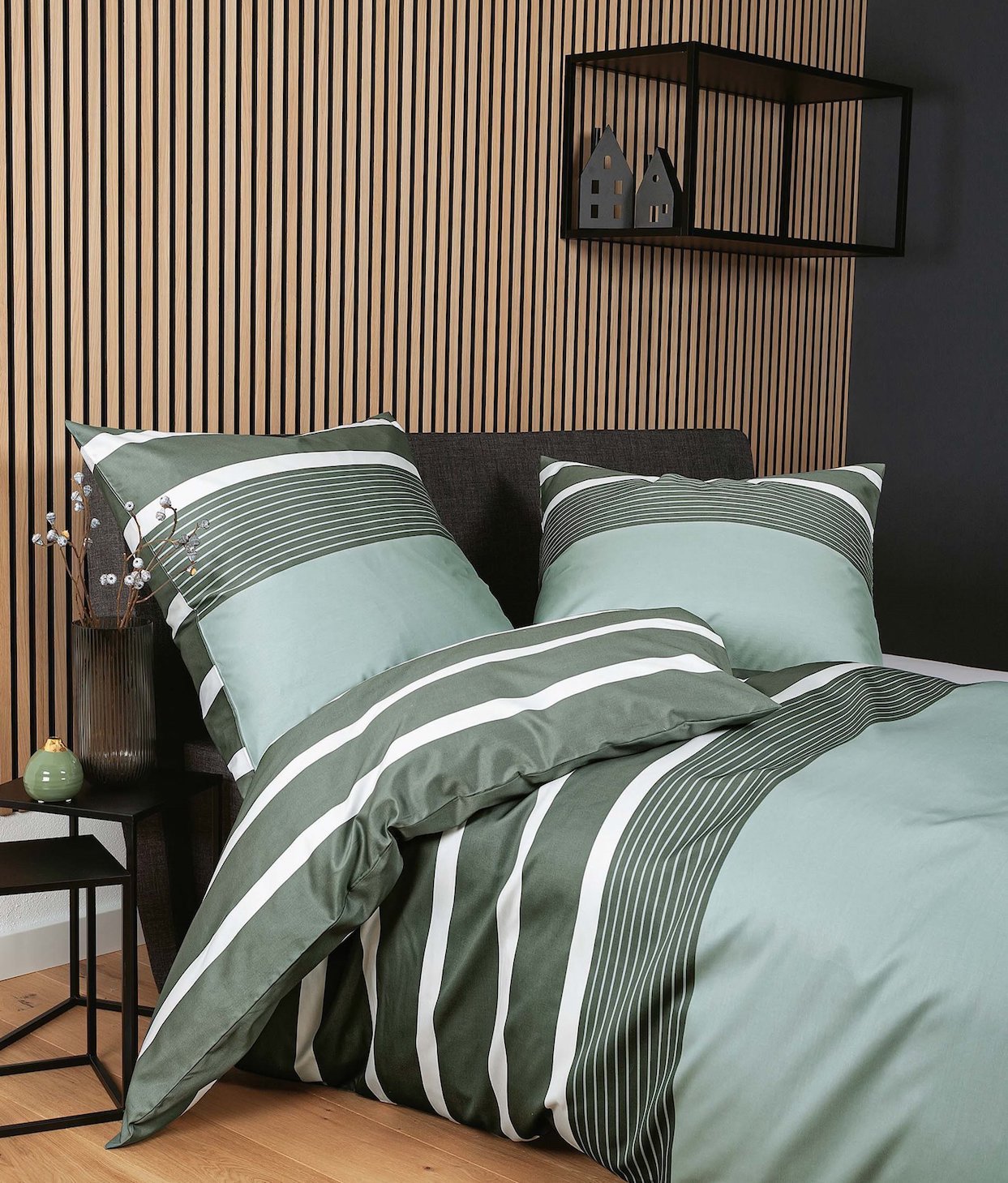 Der hochmoderne Streifendruck der Janine Mako-Satin Bettwäsche, überzeugt durch eine geniale Mischung aus breiten und schmalen Streifen, sowie unifarbenen Flächen. Die Garnitur ist in einem sehr eleganten Nougat-Schwarz, Silber-Schwarz und Salbeigrün erhältlich. Das Modell J.D. 8468 sorgt für einen maximalen Schlafkomfort, da der Bettbezug aus feinen, supergekämmten Mako-Garnen in 100% naturreiner Baumwolle hergestellt wird. Die Bettbezüge sehen nicht nur sehr edel aus, sondern sind zudem mit ihrer angenehm glatten Oberfläche duftig-leicht auf der Haut und garantieren einen wunderbaren Schlafkomfort bei angenehmer Luftdurchlässigkeit. Außerdem ist diese Bettwäsche aus Mako Satin unkompliziert in der Pflege und Reinigung: Nach normaler Wäsche mit 60° C kann die Bettwäsche im Trockner oder auch auf der Wäscheleine schnell getrocknet werden. Dabei muss nur nach persönlichem Bedarf leicht gebügelt werden. Holen Sie sich eine unschlagbare Qualität für erholsame Nächte und ein modernes Dessin ganz einfach in Ihr Zuhause.