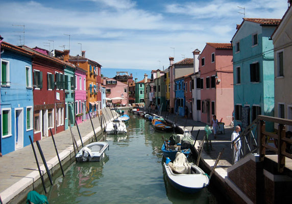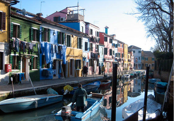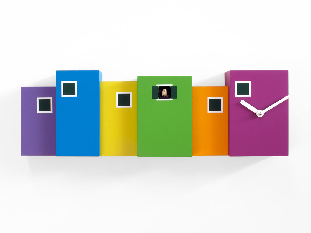 Kuckucksuhr aus Holz. Design und Farben erinnern an die Häuser der berühmten Insel Burano in der Lagune von Venedig. Batteriebetriebenes Quarzwerk. Der Kuckucksschlag wird nachts automatisch über einen Lichtsensor abgeschaltet.