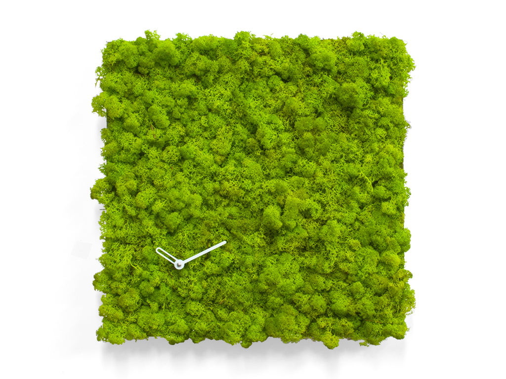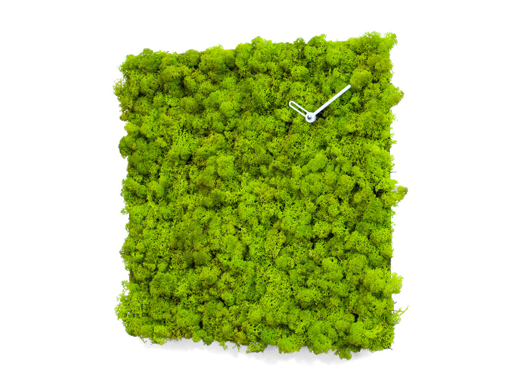 Eine Uhr mit geradlinigem, aber gleichzeitig weichem Design, revolutionär und innovativ, da sie vollständig mit Moos, einem natürlichen Flechtenmaterial, überzogen ist und auch in Räumen ohne Tageslicht eingesetzt werden kann. Die Natur ist in der Circle Clock zu Hause. Hergestellt aus Stahl und Flechten. Batteriebetriebenes Quarzwerk.