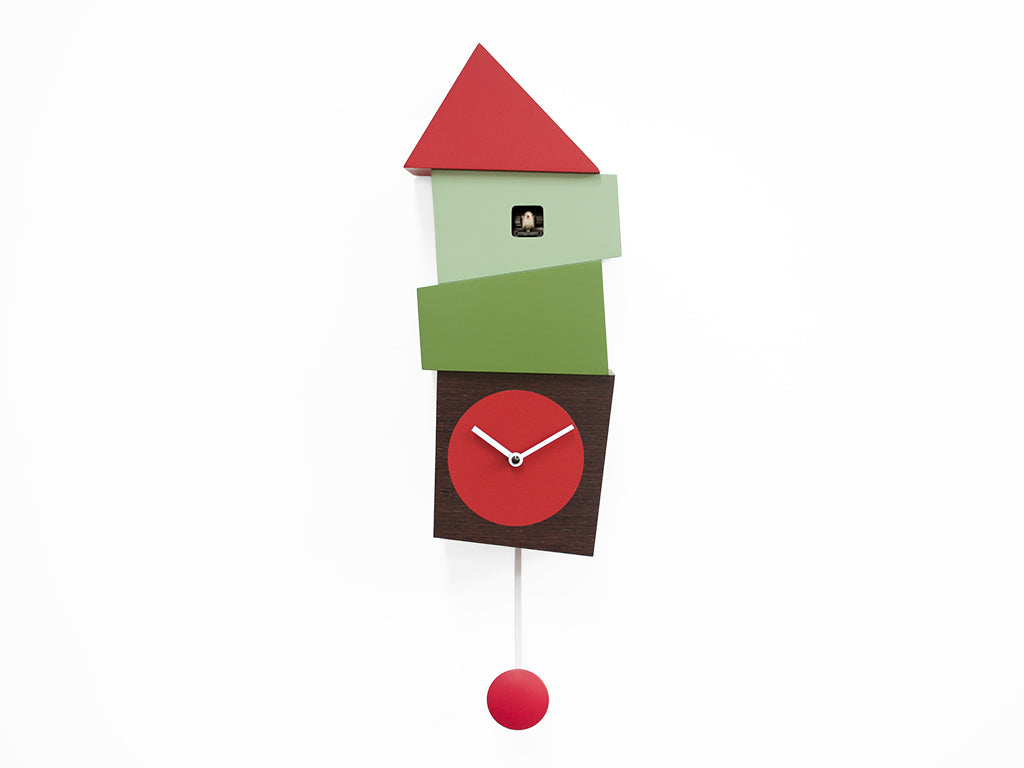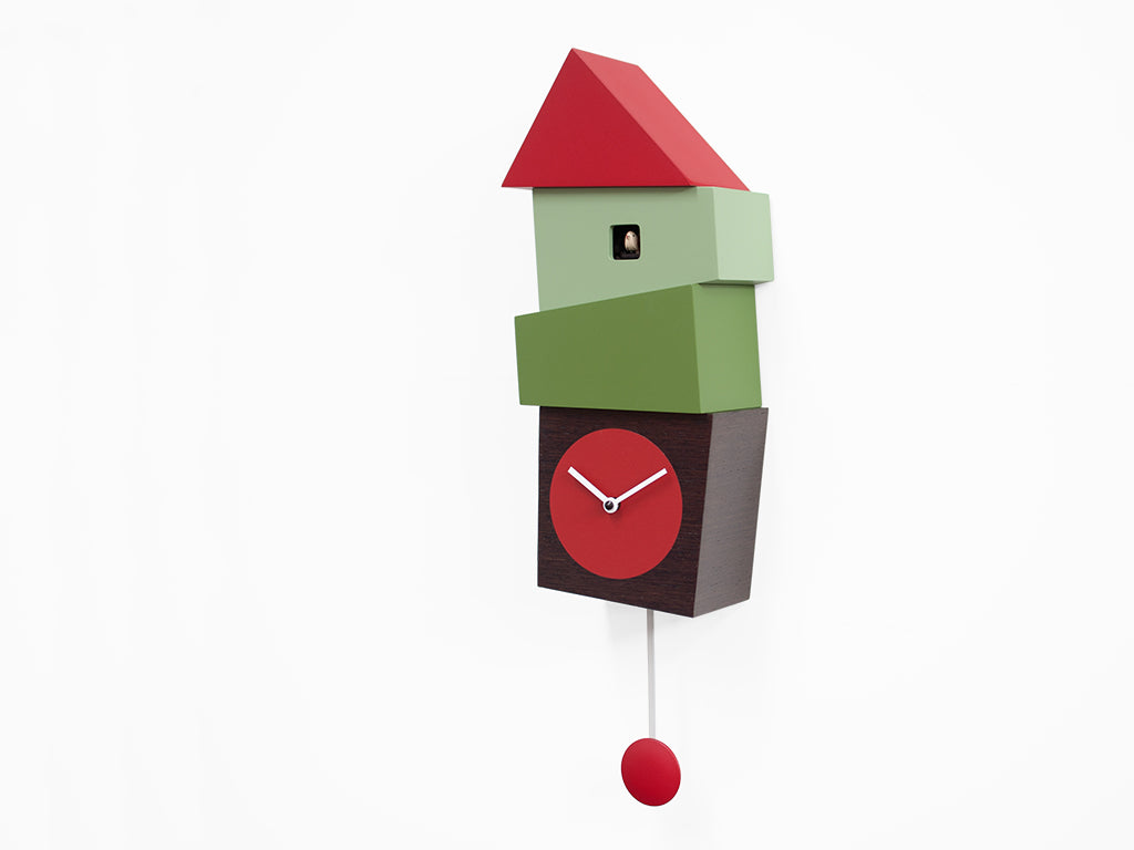 Crooked, entworfen von Alberto Sala, ist eine witzige Kuckucksuhr im unkonventionellen Stil mit krummen und ungleichmäßigen Formen, die ihr eindrucksvolles Design verstärken. Die wiederkehrenden ungleichmäßigen Formen und die fröhlichen Farben, die der Designer gekonnt kombiniert und vom Sockel bis zum Dach des Kuckuckshauses aufträgt, machen sie einzigartig. Das runde, ebenfalls farbige Pendel ist die einzige uns bekannte Form. Es erscheint fast unnatürlich am geneigten Sockel der Uhr und unterstreicht deren asymmetrische Form. Die Uhr ist aus Holz gefertigt und mit ungiftiger Farbe lackiert. Sie ist in vier Versionen erhältlich: Die ersten beiden sind orange und rot oder grün und marineblau, die dritte und vierte haben ein Holzelement und sind in hellem Holz mit blauen und marineblauen Details oder dunklem Holz mit roten und grünen Details gefertigt. Sie verfügt über ein batteriebetriebenes Quarzwerk mit einem intelligenten Sensor, der den Kuckucksklang bei Dunkelheit automatisch abschaltet.