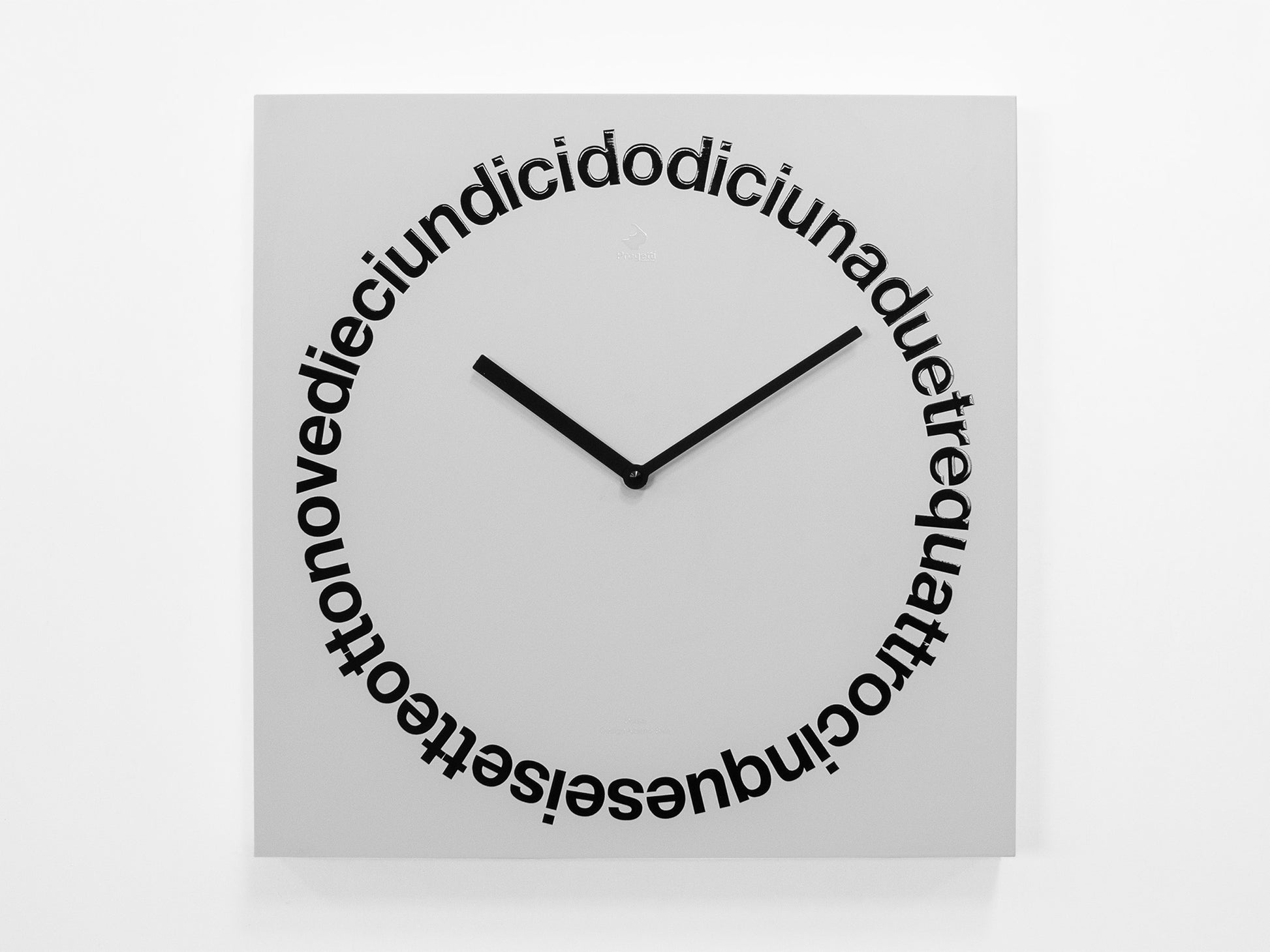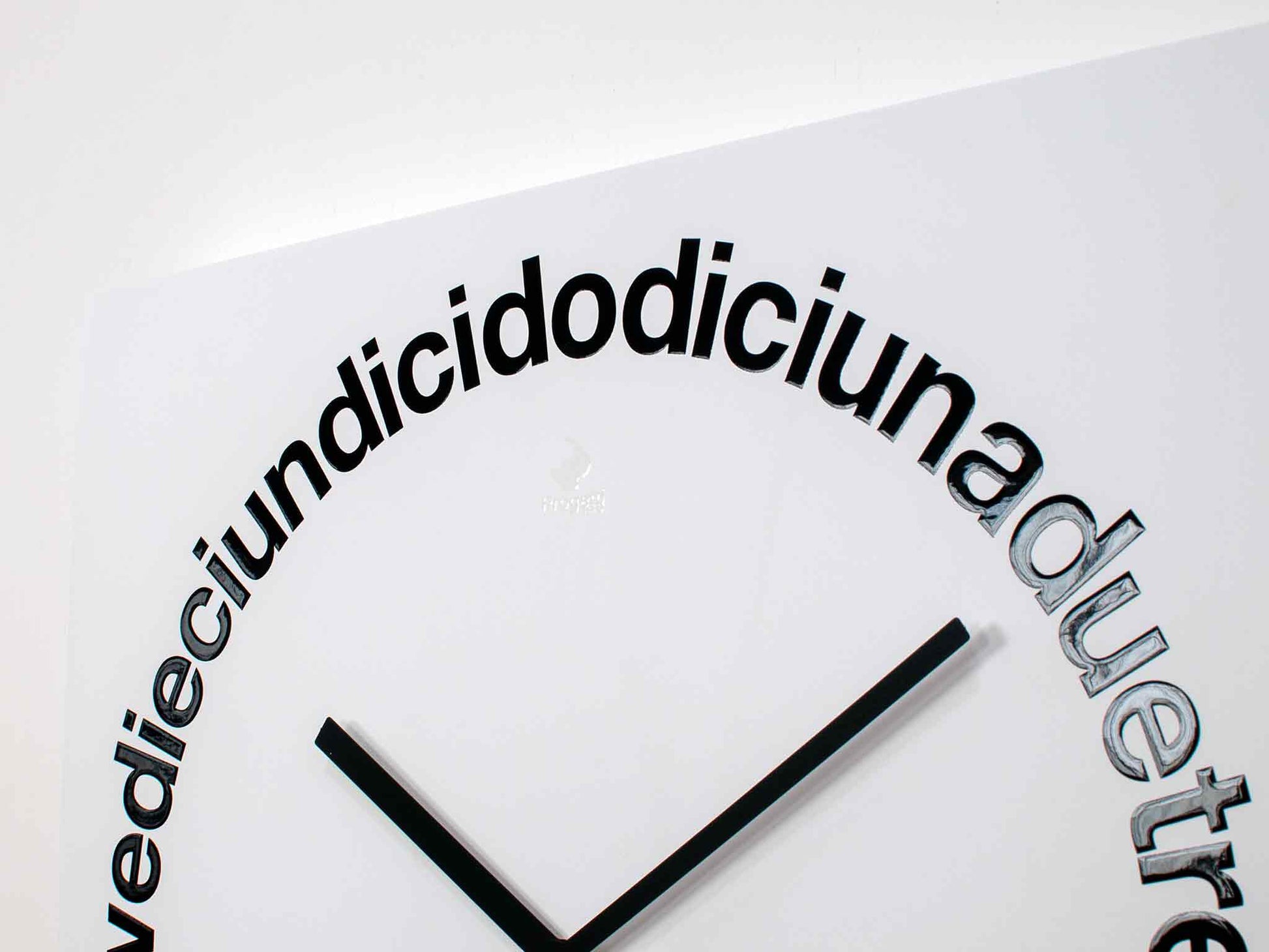 Dodici, entworfen von Alberto Sala, ist eine Wanduhr, bei der Zahlen zu Buchstaben werden, die sich ohne Unterbrechung gegenseitig überflügeln und so ein einzigartiges, ausdrucksstarkes Zifferblatt bilden. Die Schriften sind erhaben und glänzend, dank einer speziellen Technik, die einen angenehmen Kontrast zum deckenden Lack der Holzstruktur erzeugt. Sie können zwischen der italienischen und der englischen Version wählen. Das batteriebetriebene Quarzwerk stammt aus deutscher Produktion.
