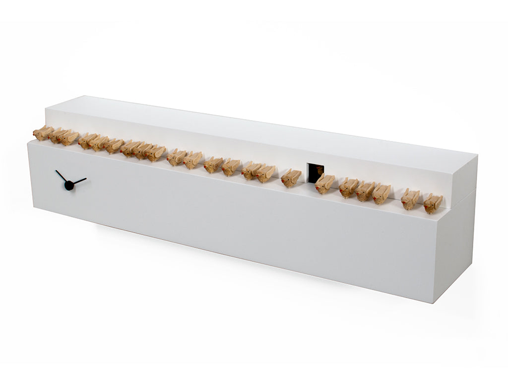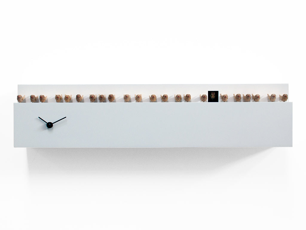 Fatti+inlà (Geht ein bisschen zur Seite!) ist eine Kreation von Andrea Grattaroli vom Studio Kuadra und ein Beispiel seiner überbordenden Kreativität. Das Design stellt eine imaginäre Reihe von Vögeln auf einem Haussims dar. Einer der Vögel, der Kuckuck, schiebt sich aus seinem Nest und nimmt seinen Platz in der Reihe ein. Das inspirierende Konzept ist recht einfach, das Endergebnis jedoch sehr elegant. Diese Uhr kann an die Wand gehängt oder hingestellt werden. Die 22 Holzvögel sind alle handgefertigt und auf zwei perfekt ausbalancierten Holzklötzen angeordnet. Der 23. Vogel zwitschert stündlich, bewegt sich vorwärts und verbeugt sich. Zwei feine Zeiger zeigen die Zeit an. Die Uhr ist in zwei Ausführungen erhältlich: schwarz mit weißen Zeigern oder weiß mit schwarzen Zeigern. Sie besteht aus Holz und ist mit ungiftiger Farbe lackiert. Die Rückseite der Uhr ist aus Metall, was das Aufhängen erleichtert und dem Ganzen ein stilvolles Finish verleiht. Der batteriebetriebene Kuckucksmechanismus verfügt über einen lichtempfindlichen Sensor, der den Kuckucksklang bei Dunkelheit automatisch abschaltet. Außerdem verfügt es über einen Schalter, um die Lautstärke des Kuckucksgeräusches zu regulieren oder es ganz abzuschalten.