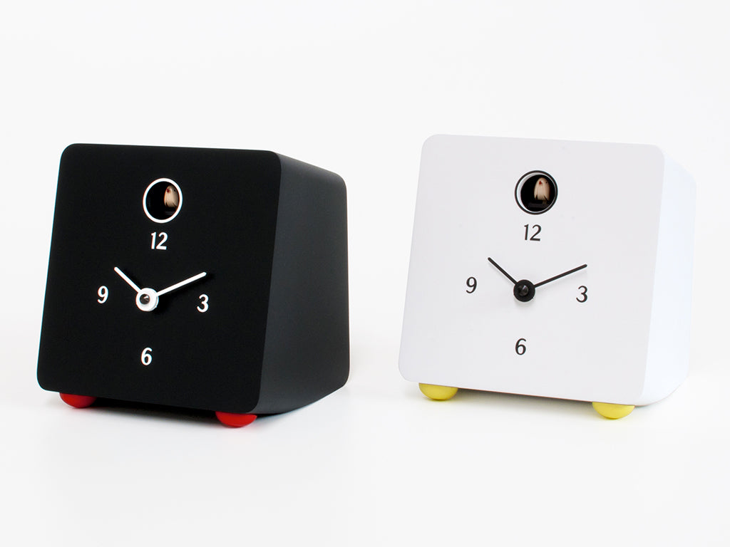 Tischkuckucksuhr, inspiriert von den Formen eines berühmten Fernsehers aus den 60er Jahren, mit klaren, weichen und abgerundeten Linien. Ein Objekt, das „bereits zu Hause“ ist, bereits in den Erinnerungen vieler oder in der Fantasie derer präsent, die fasziniert sind von den Jahren der ersten Schritte auf dem Mond, von Mythen, die geboren wurden und bis heute existieren, wie die Beatles und die Rolling Stones, sowie von vielen Ereignissen, die Spuren hinterlassen haben. Fido ist aus schwarz lackiertem Holz gefertigt. Es ist ein kompaktes Objekt, das als treuer Begleiter während der Arbeitsstunden auf ein Regal, ein Möbelstück oder Ihren Schreibtisch passt. Batteriebetriebenes Quarzwerk.