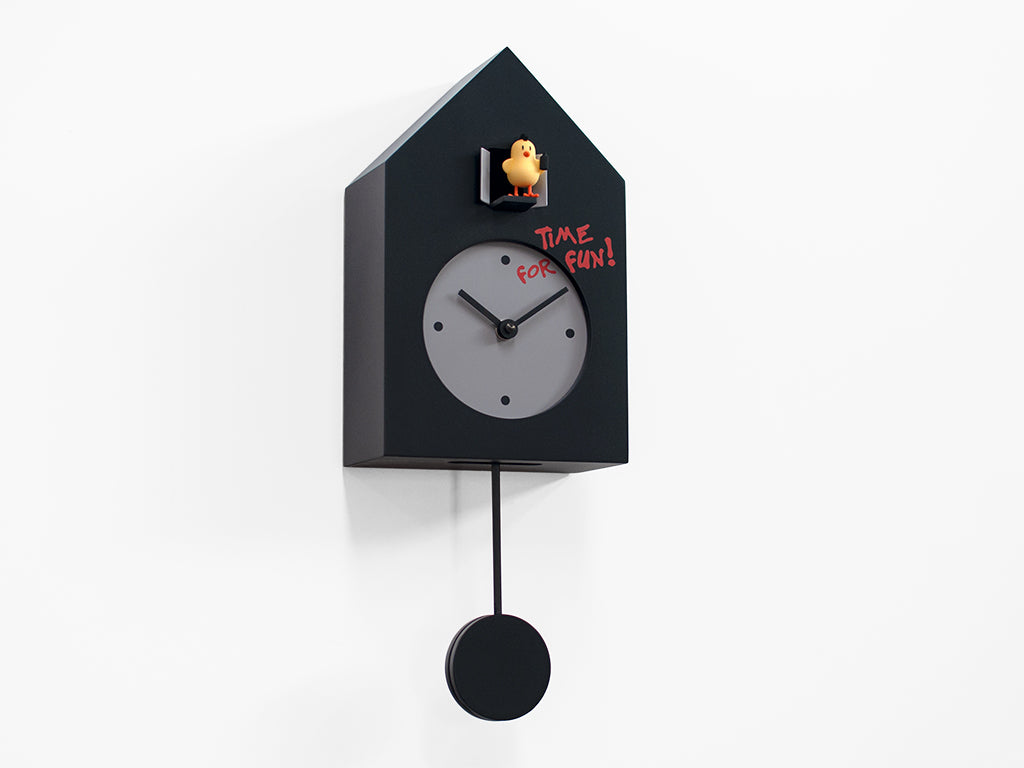 Freebird, entworfen von Gerardo Marì, stellt eine ironische Weiterentwicklung der klassischen Kuckucksuhr dar, ohne es zu sein. Tatsächlich hat sich der kleine Vogel zu einem charmanten und attraktiven Design entwickelt: Er wird zunächst frei, dann zum harten Kerl oder Punk und nimmt verschiedene Positionen ein: Er reitet auf dem Pendel oder schwingt wie Tarzan an der Pendel-Liane. Als Bad Boy trägt er einen schwarzen Hut und eine schwarze Brille, die seine Kühnheit und sein unkonventionelles Verhalten unterstreichen. In der Punk-Version trägt er einen klassischen schwarzen Irokesenschnitt und eine Sprühflasche, mit der er gerade respektlos „Zeit für Spaß“ auf das Zifferblatt geschrieben hat. In beiden Versionen fliegt er, um noch beruhigender zu wirken, über das Pendel und nutzt es als Wippe oder als Liane, wenn er zu Tarzan wird. Das Gehäuse ist in fünf Grundfarben erhältlich: Weiß, Schwarz, Hellblau, Blau oder Rot. Die Quadranten bzw. Zeiger wechseln die Farbe passend zur Struktur. Die Pendel sind in allen Ausführungen schwarz, variieren jedoch in der Form. Sie bestehen aus Holz und sind mit ungiftigen Farben bemalt. Hochwertiges Quarzwerk aus deutscher Produktion mit Batteriebetrieb.