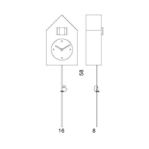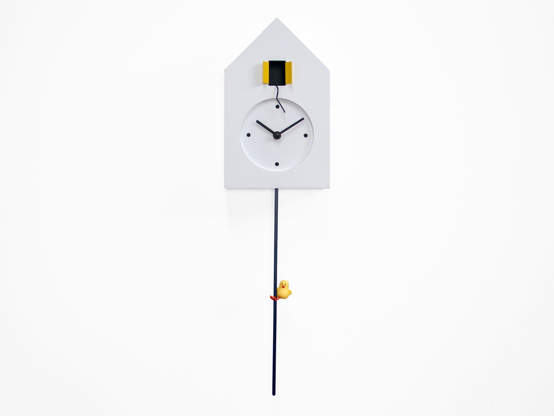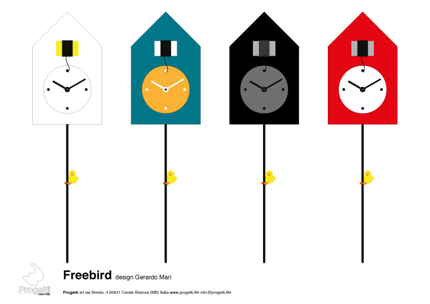 Freebird, entworfen von Gerardo Marì, stellt eine ironische Weiterentwicklung der klassischen Kuckucksuhr dar, ohne es zu sein. Tatsächlich hat sich der kleine Vogel zu einem charmanten und attraktiven Design entwickelt: Er wird zunächst frei, dann zum harten Kerl oder Punk und nimmt verschiedene Positionen ein: Er reitet auf dem Pendel oder schwingt wie Tarzan an der Pendel-Liane. Als Bad Boy trägt er einen schwarzen Hut und eine schwarze Brille, die seine Kühnheit und sein unkonventionelles Verhalten unterstreichen. In der Punk-Version trägt er einen klassischen schwarzen Irokesenschnitt und eine Sprühflasche, mit der er gerade respektlos „Zeit für Spaß“ auf das Zifferblatt geschrieben hat. In beiden Versionen fliegt er, um noch beruhigender zu wirken, über das Pendel und nutzt es als Wippe oder als Liane, wenn er zu Tarzan wird. Das Gehäuse ist in fünf Grundfarben erhältlich: Weiß, Schwarz, Hellblau, Blau oder Rot. Die Quadranten bzw. Zeiger wechseln die Farbe passend zur Struktur. Die Pendel sind in allen Ausführungen schwarz, variieren jedoch in der Form. Sie bestehen aus Holz und sind mit ungiftigen Farben bemalt. Hochwertiges Quarzwerk aus deutscher Produktion mit Batteriebetrieb.