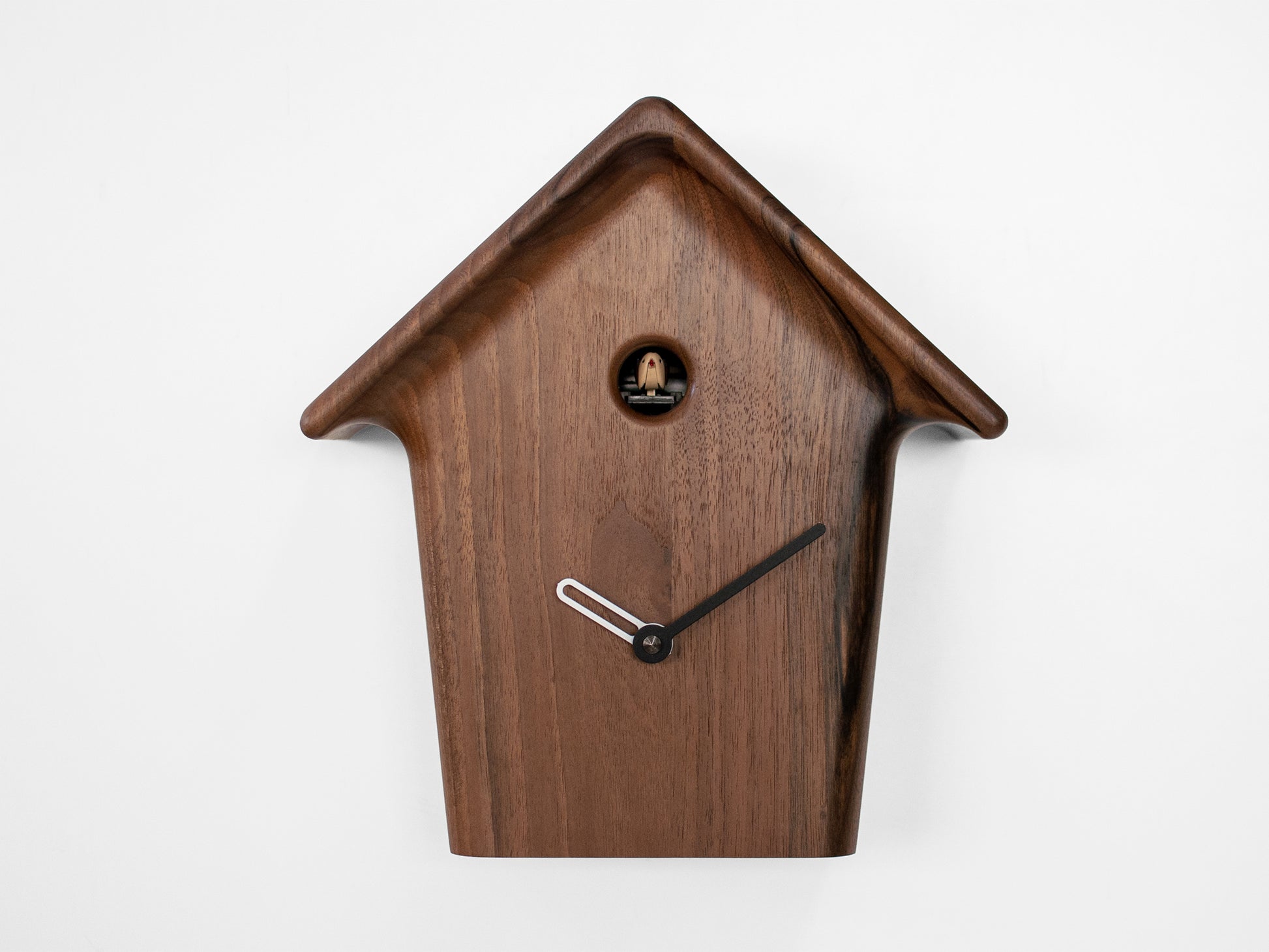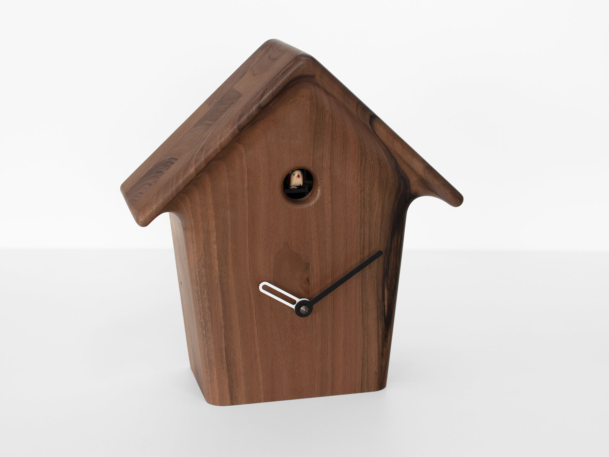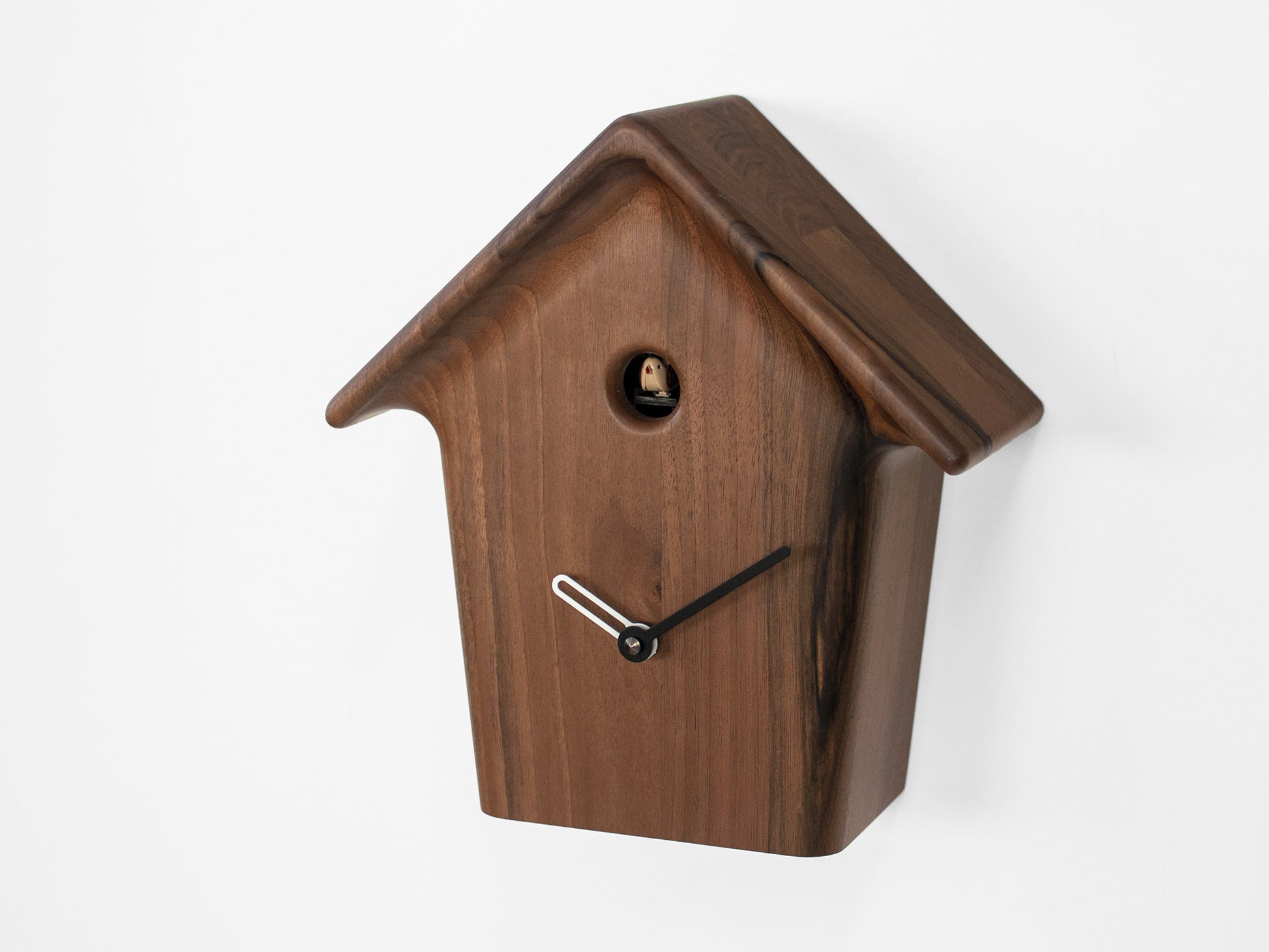 Die Mochi Mochi Kuckucksuhr, entworfen von Krit Jiratkaruen, entstand aus der Idee, ein Objekt mit weichen, luftigen Linien zu schaffen, das ihm Eleganz verleiht – ein Erfolg. Die zweifarbigen Zeiger beleben das Zifferblatt. Sie kann an die Wand gehängt, aber auch auf den Bürotisch oder in die Regale des heimischen Bücherregals gestellt werden. Sie ist aus einem einzigen Block wertvollen massiven Nussbaumholzes gefertigt, mit hochtechnologischen Verfahren bearbeitet und von Hand vollendet. Die Lackierung erfolgt mit ungiftigen Farben. Das hochwertige Kuckuckswerk deutschen Designs wird mit zwei Batterien betrieben. Ein Lichtsensor verhindert, dass der Kuckuck bei Dunkelheit ruft. Über einen Schalter lässt sich der Ton regulieren oder ganz abschalten.