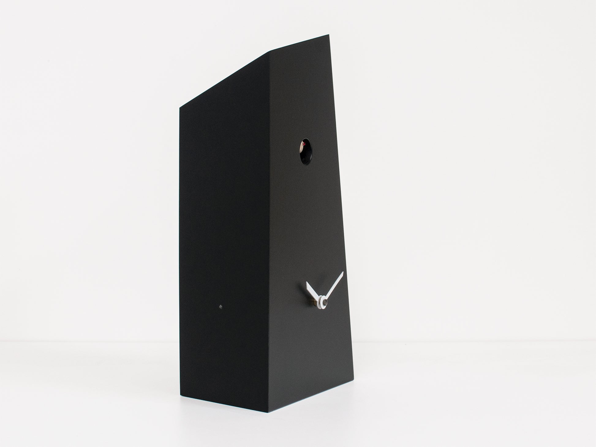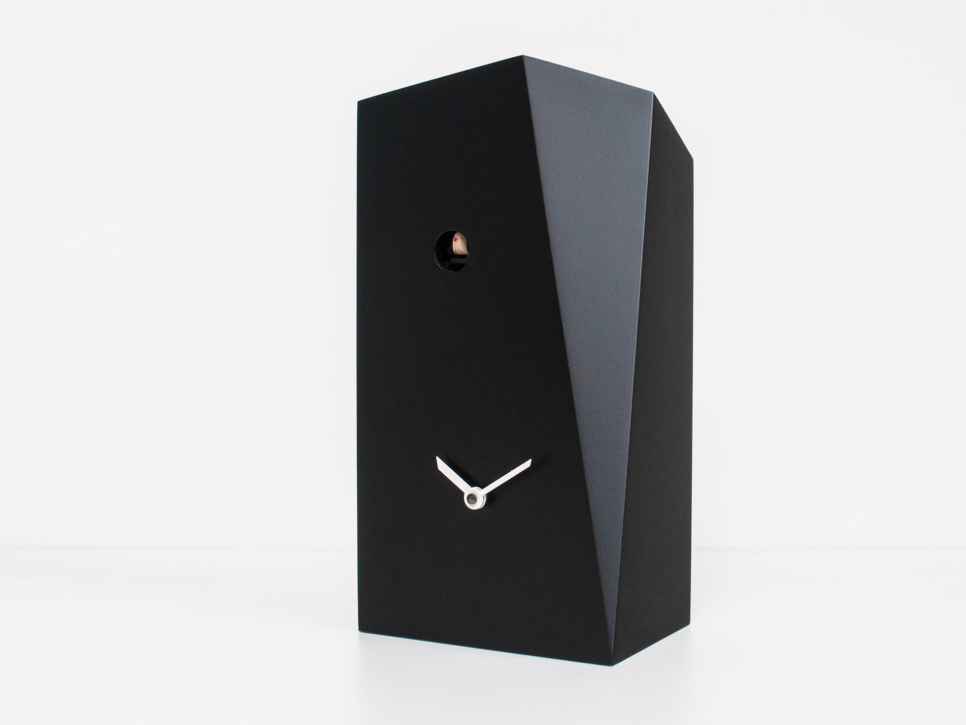 Die von Ewald Winkelbauer entworfene Kuckucksuhr Monolith ist ein asymmetrischer monolithischer Block mit einem eingearbeiteten Vogelhäuschen. Die ebenfalls asymmetrischen Zeiger vervollständigen das Zifferblatt. Die Struktur wurde in einer komplexen Technik aus Holz gefertigt und mit ungiftigen Farben bemalt. Eine Version wurde mit einem Flüssigmetallsockel versehen, der ihr ein edles und einzigartiges Aussehen verleiht. Perfekt für jedes raffinierte, elegante Ambiente. Das hochwertige Kuckuckswerk deutschen Designs wird mit zwei Batterien betrieben. Ein Lichtsensor verhindert, dass der Kuckuck bei Dunkelheit ruft. Über einen Schalter lässt sich der Ton regulieren oder ganz abschalten.