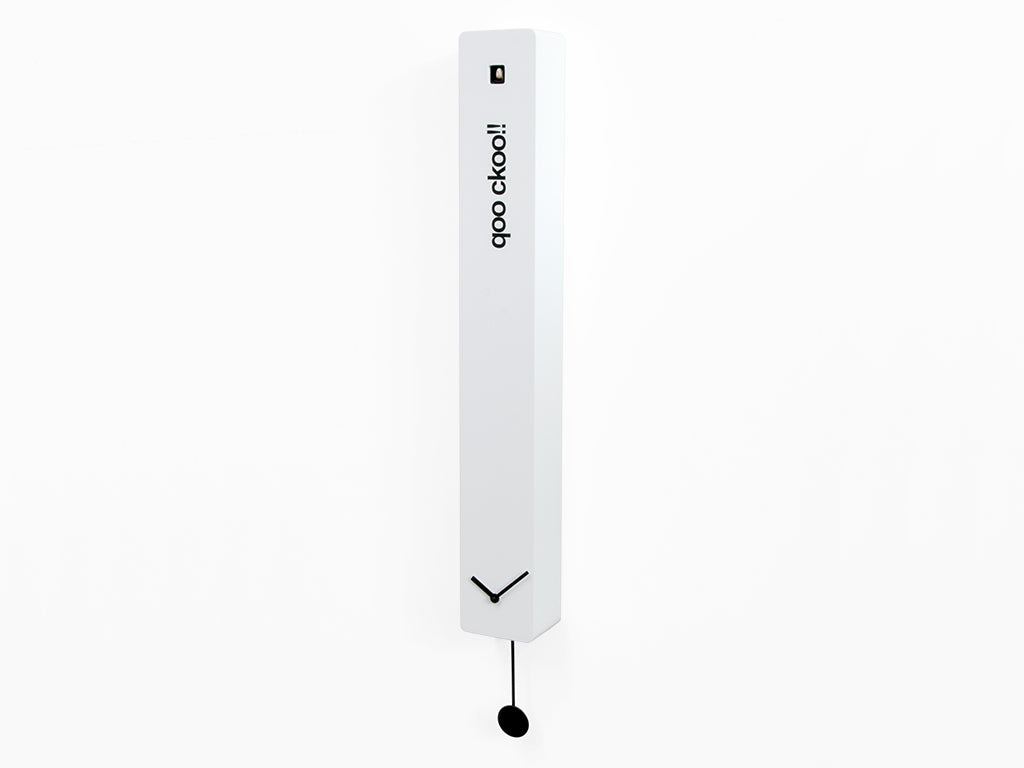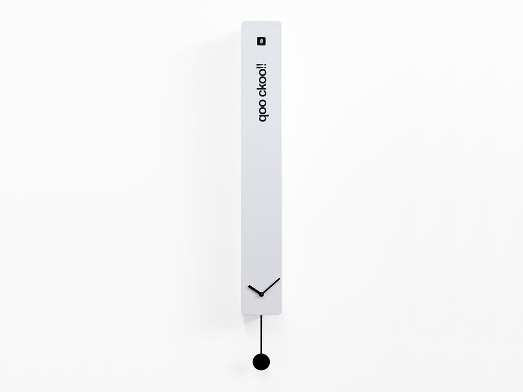 Q02 ist die erste Uhr, die sich vom Trend der Kuckucksuhren mit dem traditionellen Vogelhäuschen absetzt, die diese Uhren seit Jahren prägen. Die Kuckucksfunktion der Q02 wird durch eine schlichte, farbige horizontale oder vertikale Linie dargestellt – innovativ und wirkungsvoll zugleich. Das Pendel und der Schriftzug „coo ckoo!!“, die an einen kleinen Kuckuck erinnern, vervollständigen die Uhr. Das batteriebetriebene Uhrwerk verfügt über einen lichtempfindlichen Sensor, der den Kuckucksruf bei Dunkelheit automatisch abschaltet. Zusätzlich gibt es einen Schalter, um die Lautstärke des Kuckucksrufs zu regulieren oder ihn ganz abzuschalten.