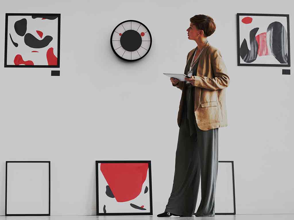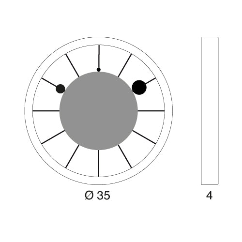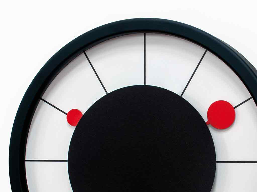 Roulette ist eine innovative Wanduhr von Bruna Rapisarda, die an das bekannte Casinospiel erinnert. Die Zeiger, insbesondere der zweite, stellen die rotierende Kugel im Rouletterad dar. Dieser Effekt wird durch die auf das Glas gedruckte Scheibe verstärkt, die den Zeigerschaft verdeckt und nur die runde Spitze sichtbar macht. Sie besteht aus Metall, Kunststoff und Glas und ist mit ungiftigen Farben lackiert. Batteriebetriebenes Quarzwerk aus deutscher Produktion.