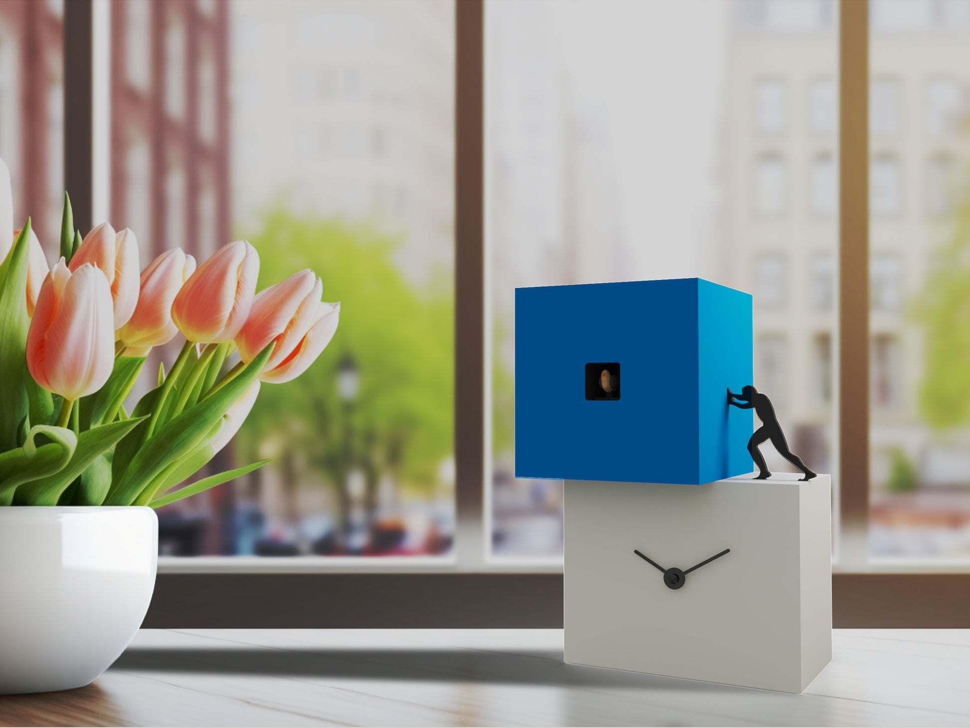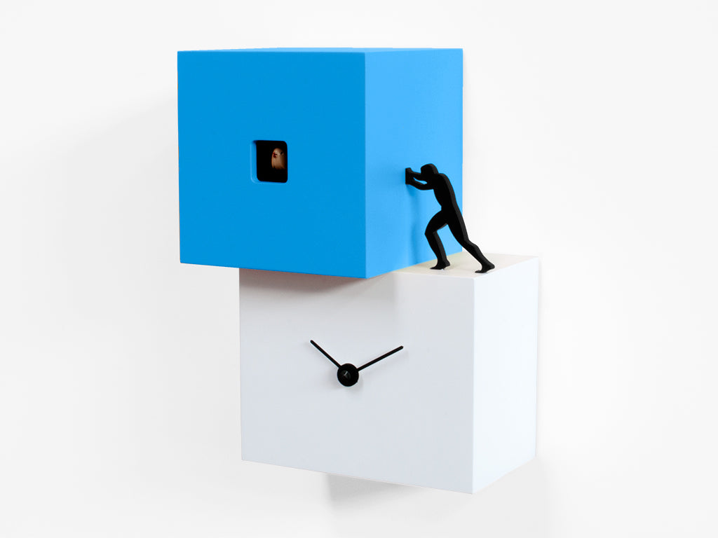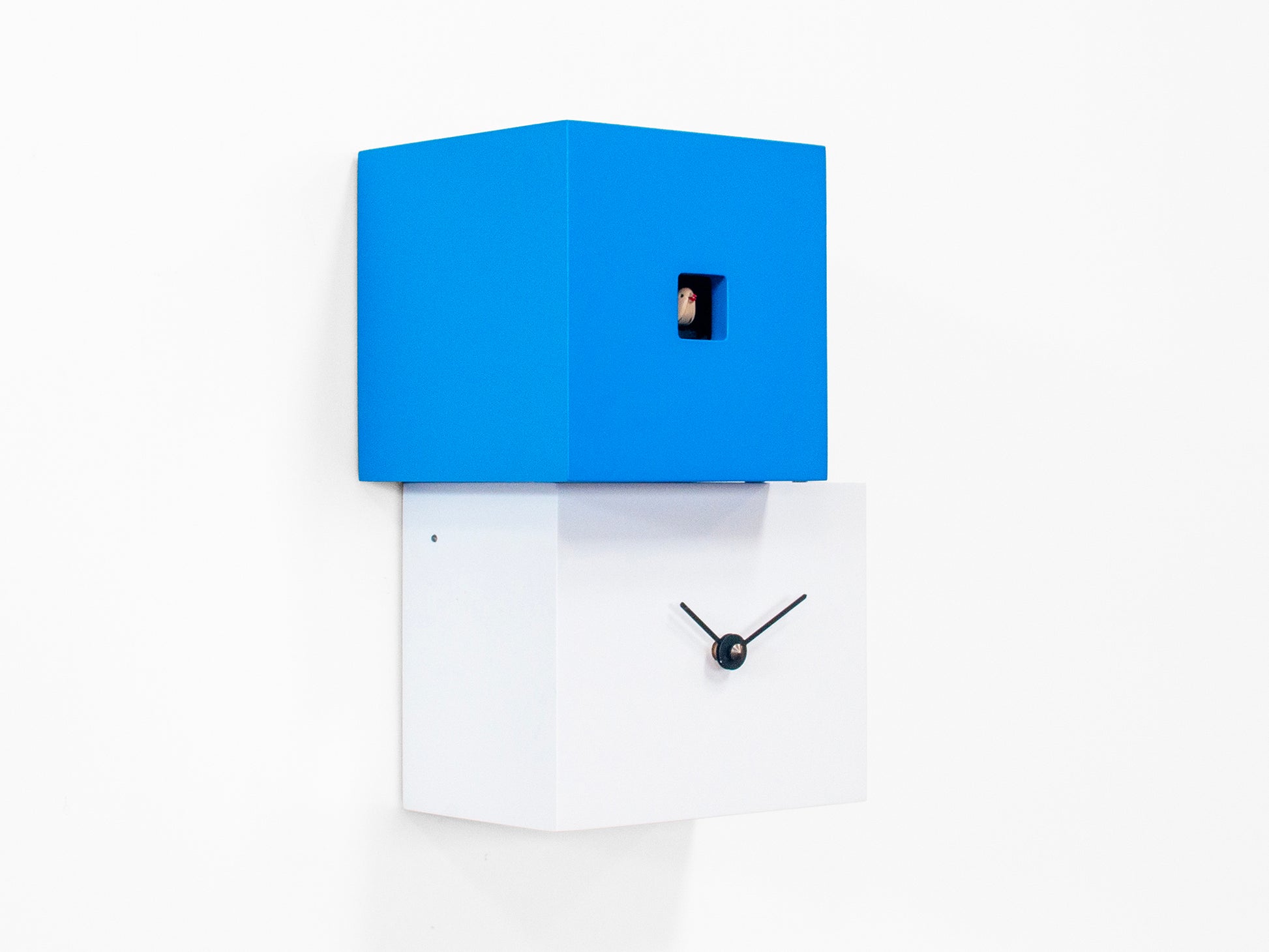 Wand- oder Tischkuckucksuhr bestehend aus zwei oder drei Körpern in verschiedenen Farben, inspiriert von der menschlichen Arbeit, ein modernes Objekt, schlicht, aber bedeutsam, kraftvoll und klar definiert. Eine Kuckucksuhr, die uns inspirieren und uns daran erinnern soll, dass die Zeit vergeht und wir weitermachen müssen, um Kraft und Energie für das zu finden, was wir tun müssen. Elemente unterschiedlicher Größe und Höhe, die versetzt angeordnet sind, erwecken Strong Cuckoo aus lackiertem Holz zum Leben. Batteriebetriebenes Quarzwerk. Ein Lichtsensor schaltet den Kuckucksklang bei Dunkelheit automatisch ab.