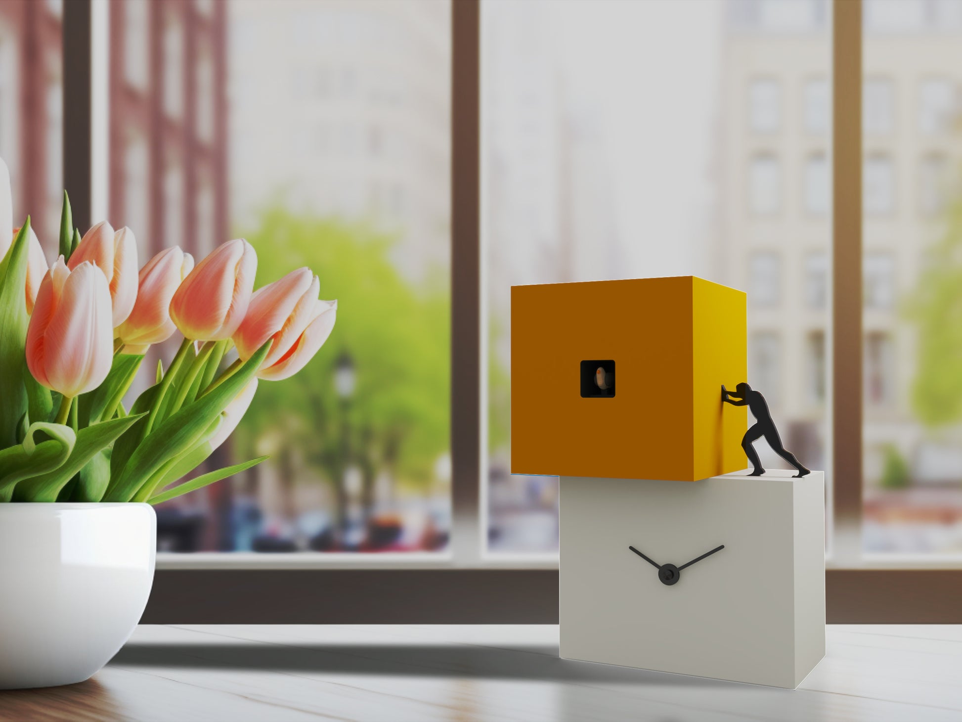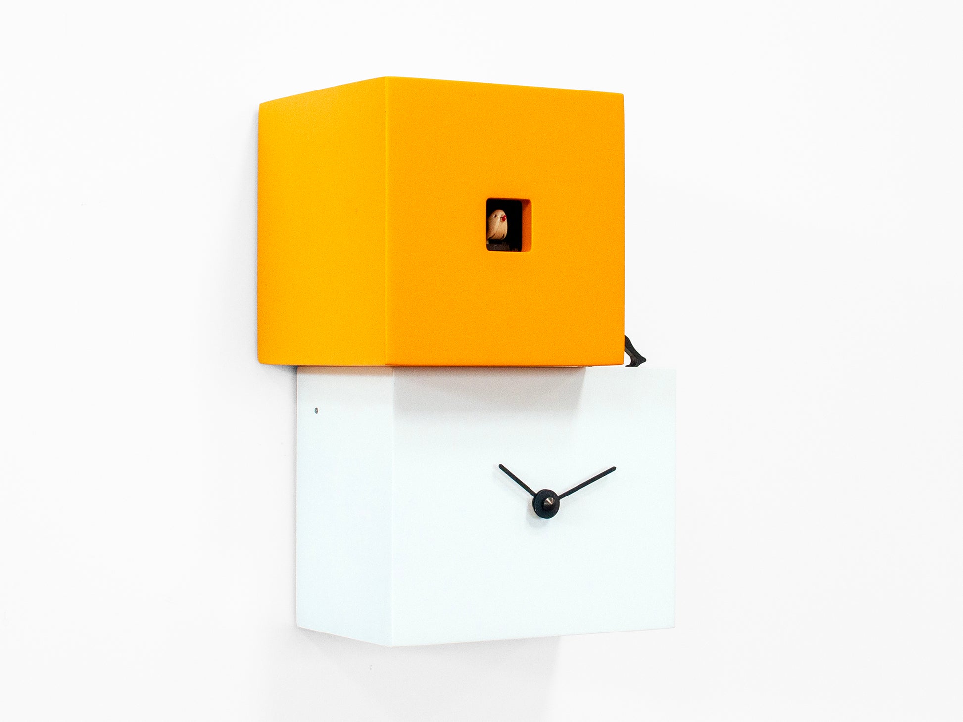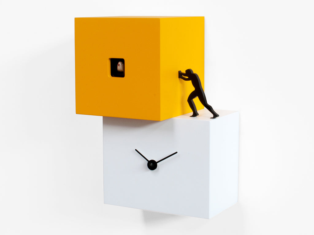 Wand- oder Tischkuckucksuhr bestehend aus zwei oder drei Körpern in verschiedenen Farben, inspiriert von der menschlichen Arbeit, ein modernes Objekt, schlicht, aber bedeutsam, kraftvoll und klar definiert. Eine Kuckucksuhr, die uns inspirieren und uns daran erinnern soll, dass die Zeit vergeht und wir weitermachen müssen, um Kraft und Energie für das zu finden, was wir tun müssen. Elemente unterschiedlicher Größe und Höhe, die versetzt angeordnet sind, erwecken Strong Cuckoo aus lackiertem Holz zum Leben. Batteriebetriebenes Quarzwerk. Ein Lichtsensor schaltet den Kuckucksklang bei Dunkelheit automatisch ab.