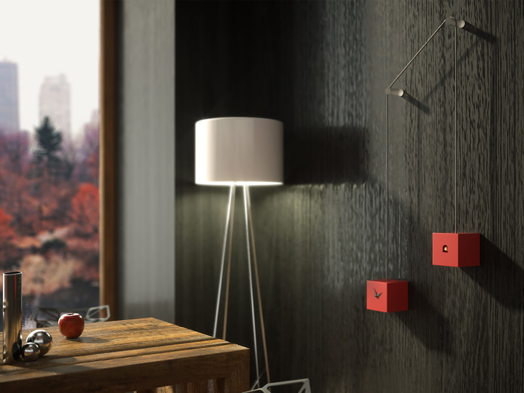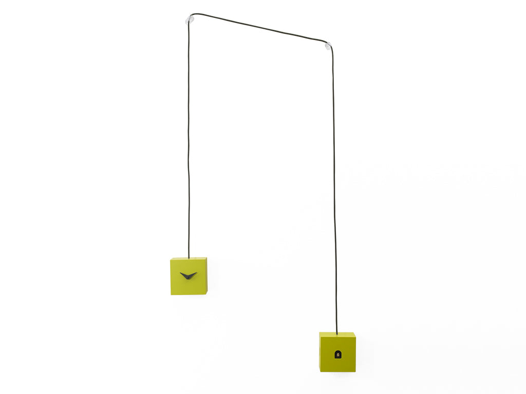 Als Kinder spielten viele von uns mit selbstgebauten Telefonen. Zwei Dosen und eine Schnur ermöglichten die Kommunikation über große Entfernungen! TuTu ist die erste Kuckucksuhr, bei der der Kuckuck über zwei Meter von der Uhr entfernt ist und die beiden über ein Stromkabel „kommunizieren“ können. Dank dieser genialen Intuition kann die Uhr auf zahlreiche Arten aufgestellt werden. Dank zweier in das Kabel eingesetzter Plexiglaszylinder können die beiden Würfel in unterschiedlicher Höhe angebracht, von der Decke gehängt oder an getrennten Wänden aufgestellt werden. Die Uhr ist aus Holz gefertigt und mit ungiftiger Farbe lackiert. Das batteriebetriebene Uhrwerk verfügt über einen lichtempfindlichen Sensor, der den Kuckucksruf bei Dunkelheit automatisch abschaltet. Außerdem gibt es einen Schalter, mit dem sich die Lautstärke des Kuckucksrufs regulieren oder ihn ganz abschalten lässt.