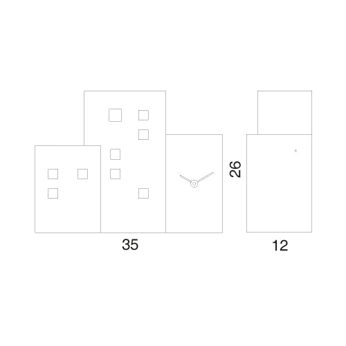 Walls Cuckoo ist eine Wand- oder Tischkuckucksuhr aus lackiertem Holz, die dank dreier unterschiedlich hoher und tiefer Volumen die Skyline einer modernen Stadt mit ihren Gebäuden und Wolkenkratzern nachbildet. Im Gegensatz zu den Profilen durchschnittlicher Städte ist Walls Cuckoo ein lineares und materielles Objekt, das durch seine Kompaktheit die dritte Dimension nachbildet. Batteriebetriebenes Quarzwerk.